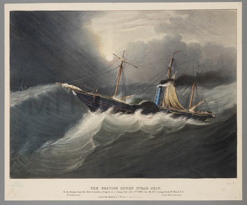The Biritsh Queen Steam Ship on her Passage from New York to … A hand-colored lithograph depicting the 'British Queen' dramatically bracing the tumultuous waves …