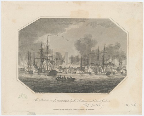 The Bombardment of Copenhagen, by Lord Cathcard, and Admiral Gambier. Scene of British vessels, in the foreground, firing on Copenhagen, which is …