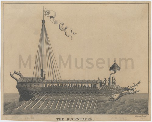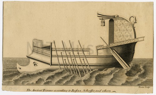 The Ancient Trireme according to Bafius, Schoeffer, and others. Uncolored engraving depicting a side view of a trireme, or three-oared galley. …
