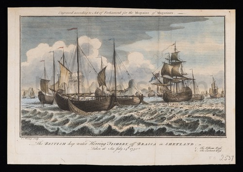 The British deep water Herring Fishery off Brassa in Shetland Colored engraving depicting whaling ships in Brassa Sound, Shetland. In the background …