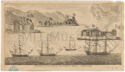 The Attack of Severndroog by Commodore James, April 2, 1755. Engraving depicting a bay with heavy fortifications and four ships on the …