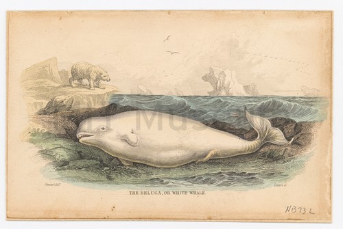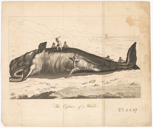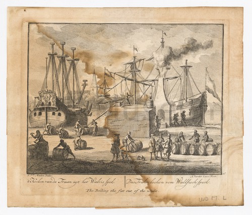 The Boiling the fat of the whale Black and white engraving depicting the boiling of whale fat. Two sailors …