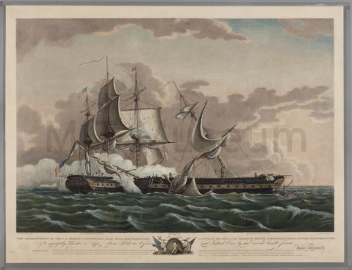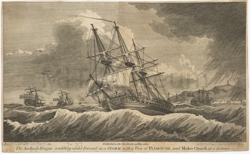 The Arethusa Frigate scudding under Foresail in a STORM, with a View … Engraving depicting three-quarter bow view of a frigate flying the British naval …
