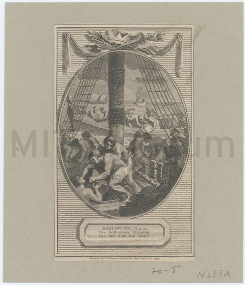 The Bostonians throwing the Tea into the water. Mounted engraving depicting the scene on board ship as Americans grasp boxes …