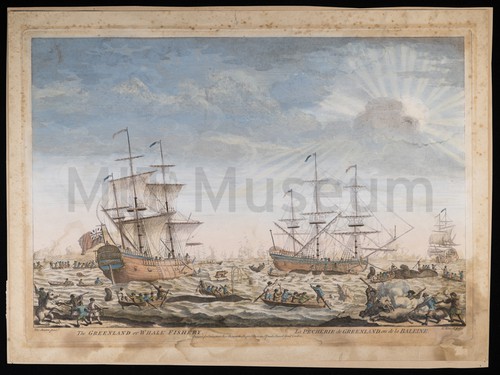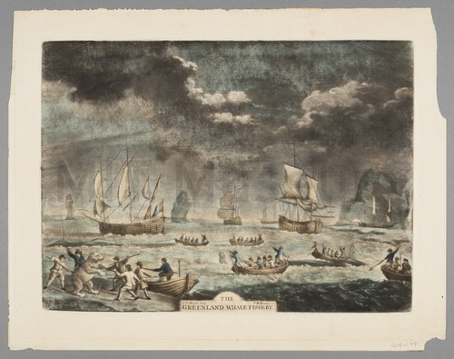 The Greenland or Whale Fishery. Handcolored print depicting a whaling scene off the Greenland coast. With title …