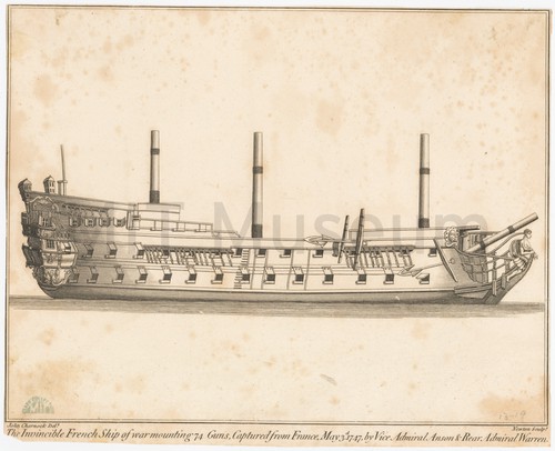 The Invincible French Ship of war mounting 74 Guns, Captured from France, … Ship portrait, side view, of a French warship with two tiers of …