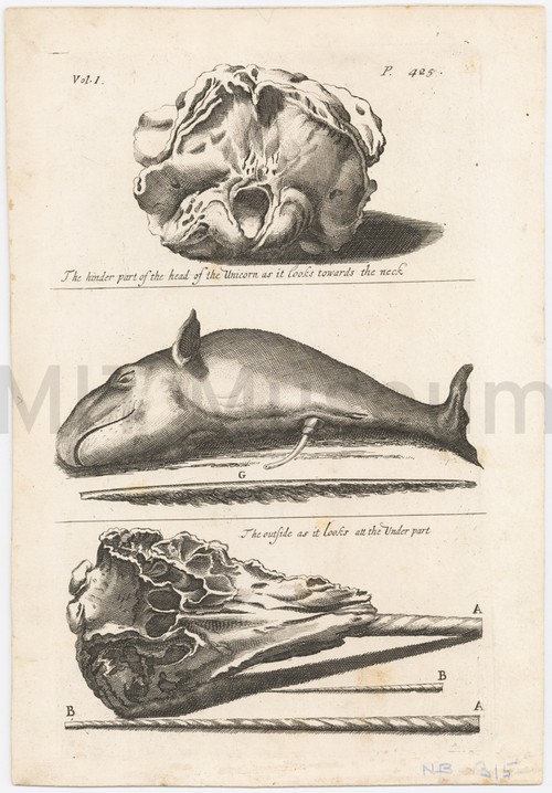 The Hinder Part of the Head of the Unicorn as it looks … Uncolored engraving divided into three parts. Top, a view of a skull …