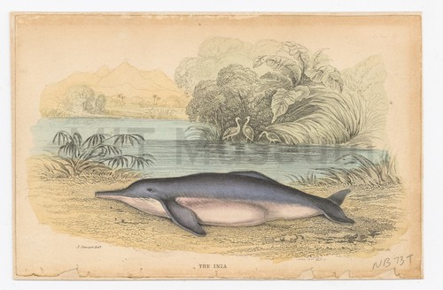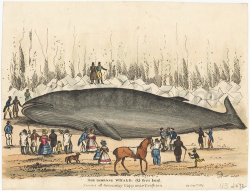 The Immense Whale. Hand-colored engraving of a large beached whale with spectators--men, women, children, and …