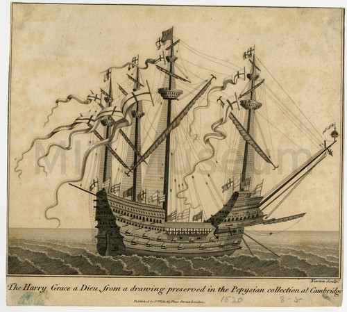 The Harry Grace a Dieu, 1520 Engraving depicting the Harry Grace-a-Dieu at sea, with a small boat attached …