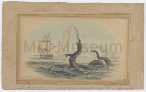 The Great Sea Serpent (according to Hans Egde) Hand-colored engraving depicting a sea serpent writhing in the water with a …