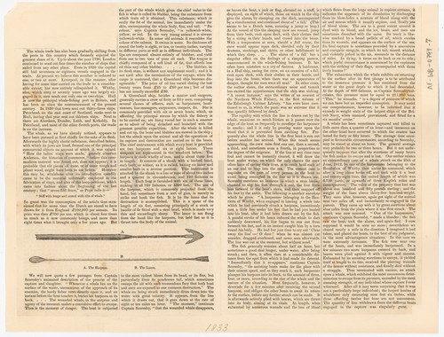 The Harponiers Poking a Whale with their lances after he is enfeebled … Colored engraving of blue-coated men in three rowboats lancing a large black …