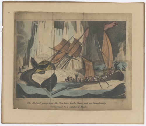 The Hobart, going down the Crew take to the Boats and are … Crudely hand-colored etching depicting several whaleboats or lifeboats in an Arctic sea, …