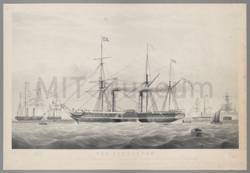 The Hindostan, of 1800 Tons and 520 Horse Power A port-broadside view of the paddle steamer 'Hindostan' of 1842. Run by …