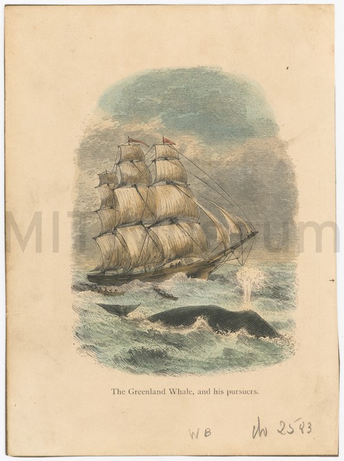 The Greenland Whale, and his Pursuers Hand-colored engraving depicting a spouting whale in the foreground, with two whaleboats …