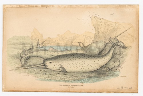 The Narwhal or Sea Unicorn A partially colored engraving showing two narwhal on shore, cliffs and birds …
