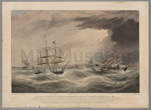 The Loss of the Pennylvania New York Packet Ship; the Lockwoods Emigrant … Hand-colored lithograph that commemorates the loss of several packet ships and an …
