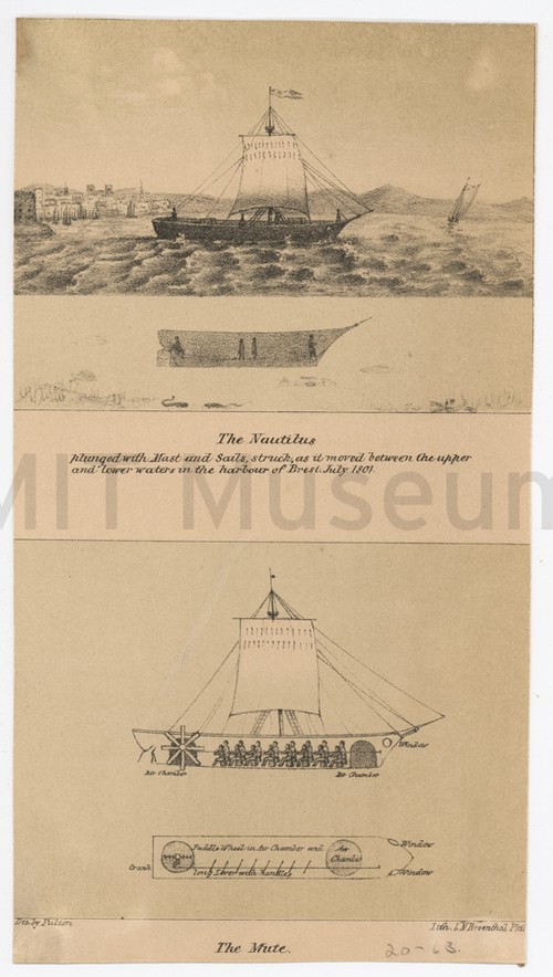 The Nautilus/plunged with Mast and Sails, struck as it moved between the … Lithograph of submarines for warfare designed by Robert Fulton. The upper view …