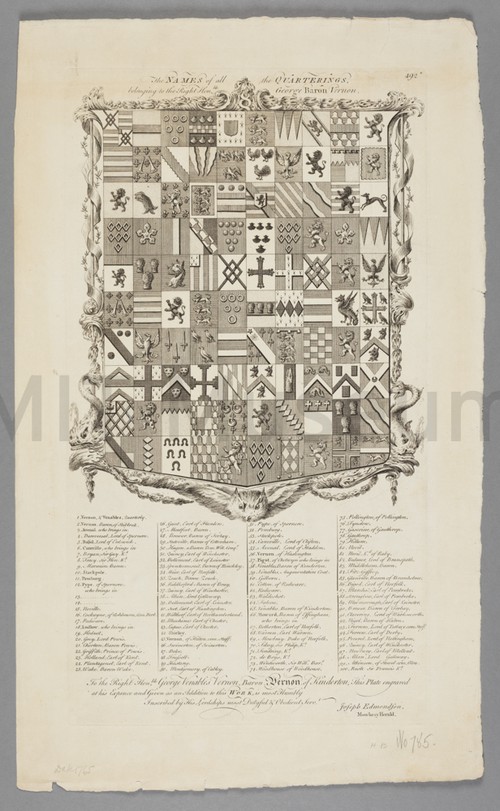 The Names of all the Quarterings Belonging to the Art. Hon. George … Uncolored engraving depicting a shield with the coats of arms of all …