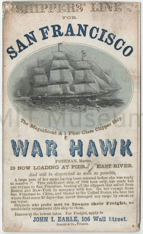 The Magnificent A 1 First Class Clipper Ship "War Hawk" Clipper card for the ship "War Hawk", departing for San Francisco. Freeman, …