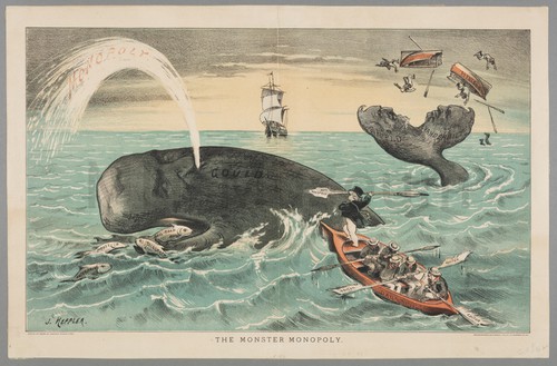 The Mysticetus or Common Whale Hand-colored engraving depicting a beached male whale, with men measuring its tail, …