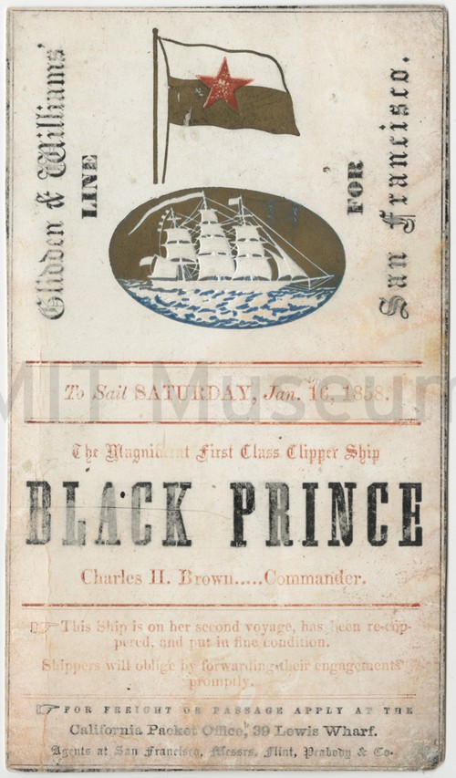The Magnificent First Class Clipper Ship "Black Prince" Clipper card for the "Black Prince", departing for San Francisco on Saturday, …