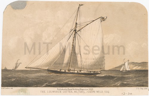 The Lulworth Cutter, 80 Tons, Joseph Weld Esq. Hand-colored lithograph depicting a side view of the cutter Lulworth at sea, …