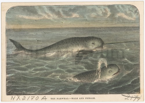 The Narwhal. Male and Female Colored engraving depicting two narwhals, one missing a horn and spouting, with …