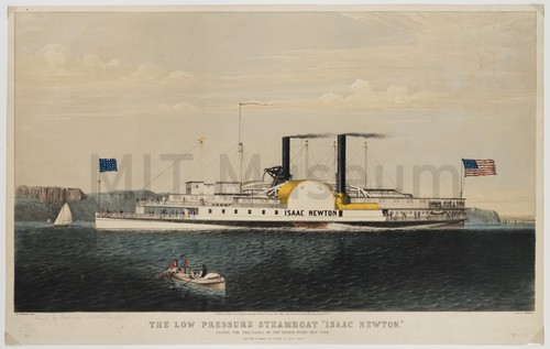The Low Pressure Steamboat "Isaac Newton". Colored lithograph of steamboat Isaac Newton sailing to left. The steamboat features …
