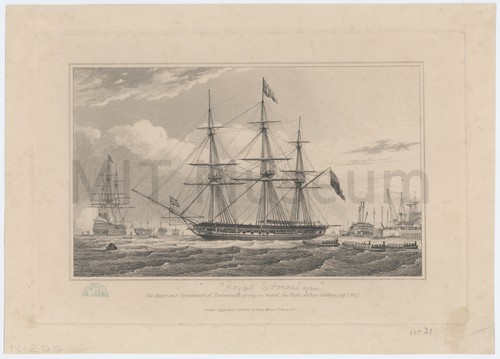 The Mayor and Corp. of Portsmouth going aboard the Yacht with an … Depiction of three boats, with numerous men aboard each, approaching the yacht …