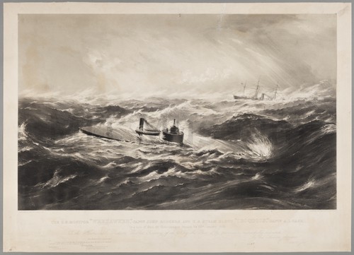 The U. S. Monitor "Weehawken," Capt. John Rodgers, and the Steam Ship … Portrait of the ironclad monitor USS Weehawken in a gale. Also pictured: …