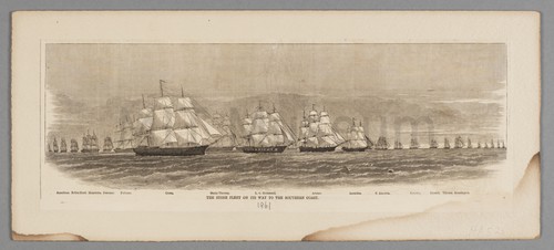 The Stone Fleet on its way to the Southern coast 1861 Newspaper illustration showing the ships of the Stone Fleet at sea. The …