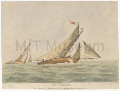 The Swallow Hand-colored engraving depicting a vessel in three-quarters bow view, with two sailors …