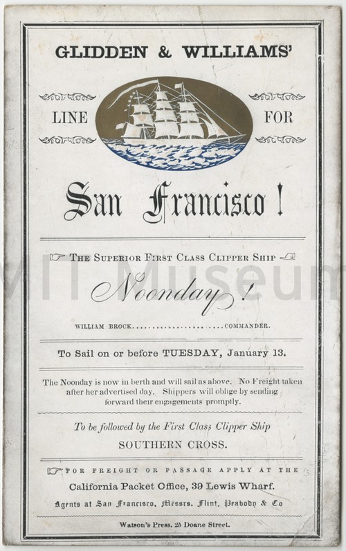 The Superior First Class Clipper Ship Noonday! Clipper card for "Noonday", sailing for San Francisco "on or before Tuesday, …