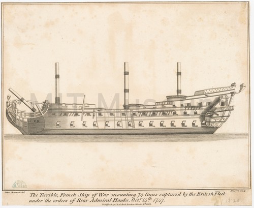 The Terrible, French Ship of War mounting 74 Guns captured by the … Uncolored engraved ship portrait, side view, of the "Terrible", a French warship …
