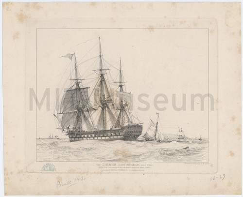 The THAMES. East Indiaman, 1424 tons. Three-quarters stern view ship portrait of the East Indiaman Thames off a …