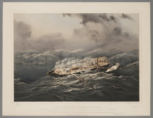 The Sutlej, East Indiaman, 1200 Tons An hand-colored lithography of a shipwrecked 'Sutlej' from a Hurricane off the …