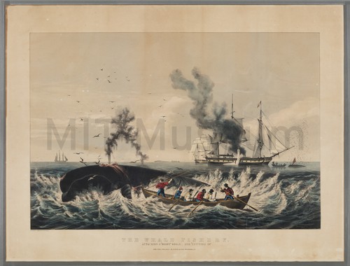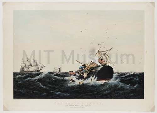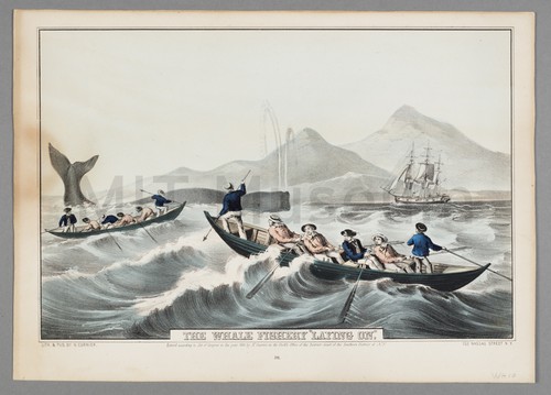 The Whale Fishery. Attacking a "Right" Whale and "Cutting In." Hand-colored lithograph depicting in the foreground men on a whaleboat harpooning a …