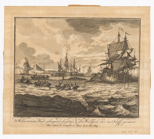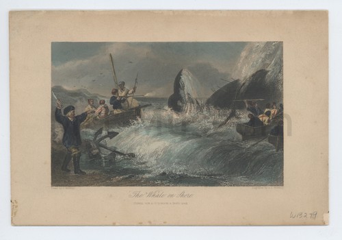The Whale on Shore Hand-colored engraving on board. The scene shows the dramatic final moments of …