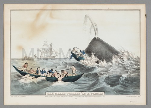 The Whale Fishery. The Sperm Whale "in a Flurry" Matted lithograph of a whale destroying a whaleboat with five fishermen.