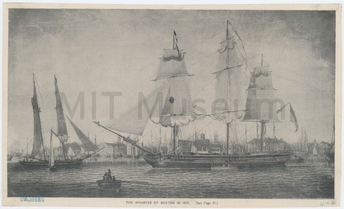 The Wharves of Boston in 1829 Reproduction of a painting of the Boston wharves with a three-masted ship, …