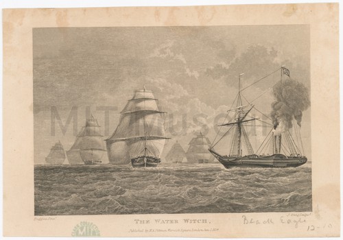 The Water Witch. Monochrome engraving depicting several ships on the water. Slightly to the left …