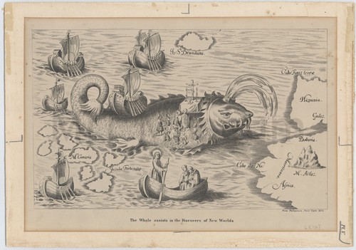 The Whale assists in the discovery of new worlds Nineteenth-century reproduction of a seventeenth century print, showing a large whale with …