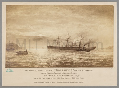 The White Star Mail Steamship "Britannic" Capt: W. H. Thompson. Steamship 'Britannic' arriving into Queenstown Harbor with mail and passengers. A small, …