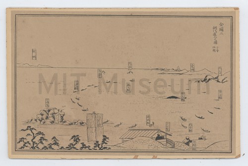 Three Japanese whaling scenes Black and white woodcut of a Japanese whaling sene depicting several whaling …