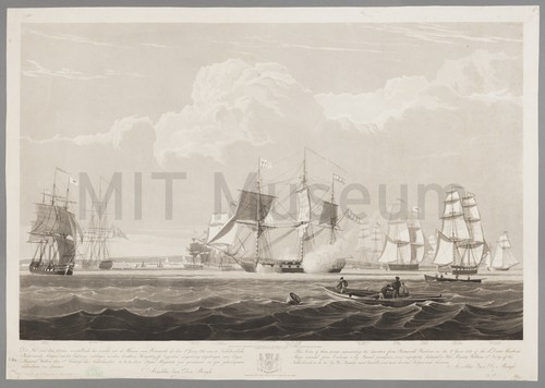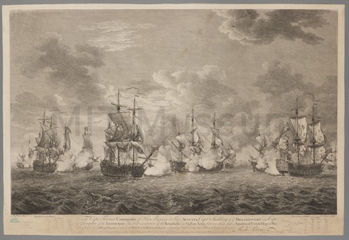To Capt. Forrest Commander of His Majesty's Ship Augusta, Capt. Suckling of … A hand-colored engraving of the naval engagement between French and British fleets …
