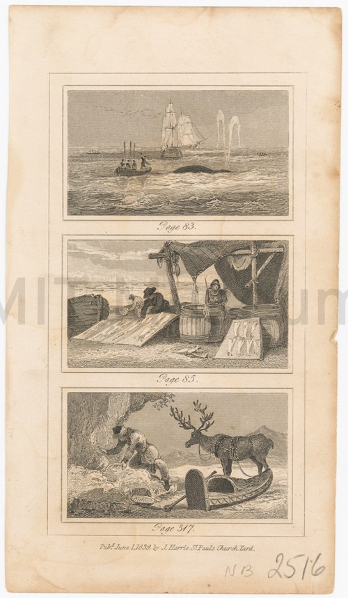 Three Cuts: One Whaling Scene the Other Two not Whaling Monochrome engraving with three scenes. Top, labeled "Page 83.", a whaling scene …