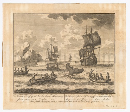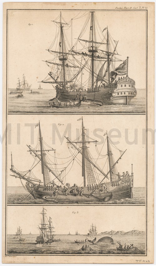 Three whaling scenes Monochrome engraving with three whaling scenes, all three including whales being lashed …
