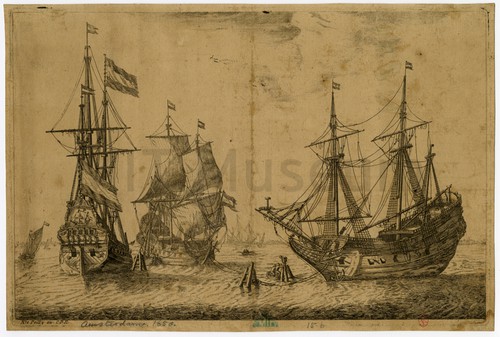 Three Dutch merchant ships Engraving depicting three Dutch merchantmen moored in shallow waters, with a city …