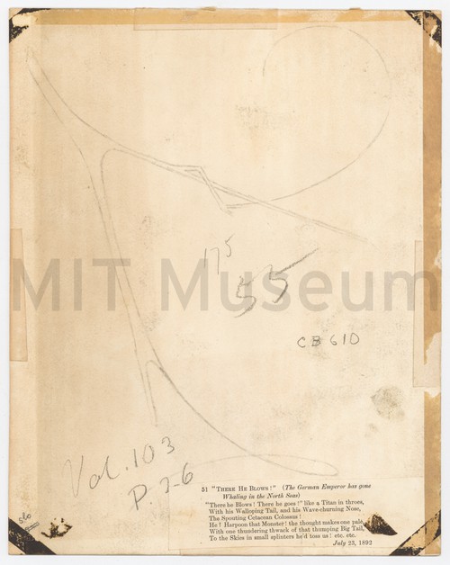 There He Blows! (The German Emperor has gone Whaling in the North … Black, white, and grey drawing of a whale with the head of …