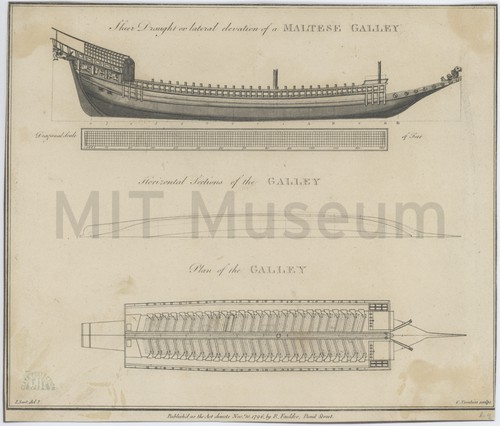 Three Plans of the Maltese Galley On one plate, illustrates three plans views: sheer draft or lateral elevation, …